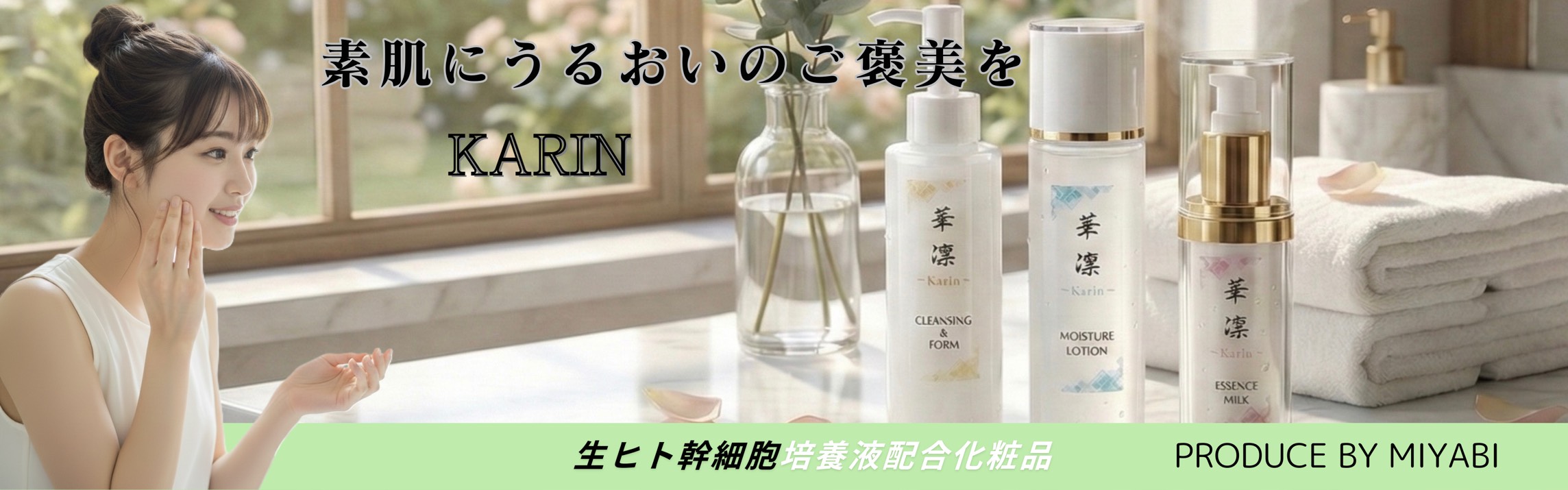 年齢とともに「保湿しても乾燥する」「浸透感がなじみにくい気がする」「ハリ・ツヤが戻りにくい」——そんななんとなくの変化が積み重なると、スキンケア選びが難しくなりますよね。MIYABIの華凛(KARIN)シリーズは、ヒト幹細胞培養液やナノカプセル加工といった設計思想で、年齢に応じたケア(エイジングケア)を日々のルーティンに落とし込みやすくしたラインです。